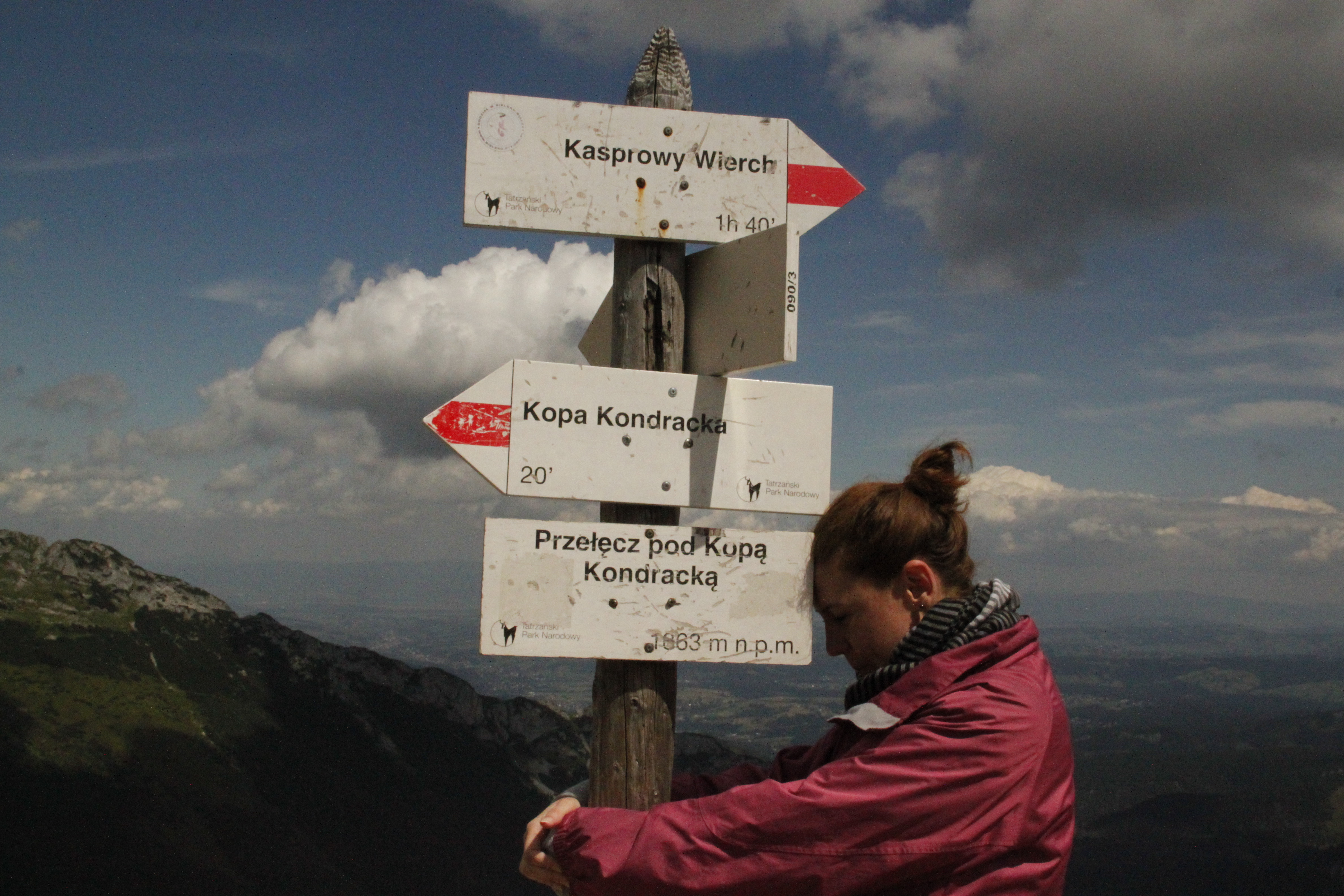 Docieramy do Przełęczy pod Kopą Kondracką (1863 m n.p.m). Stąd rozpościera się cudowny widok. Przy dobrej pogodzie ładnie widać krzyż na Giewoncie. Zawroty głowy ustępują. Na górze czuję się już bezpieczniej. Do czasu…