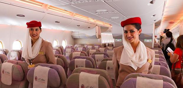 Zaraz po wejściu do samolotu czuć miłą atmosferę. Stewardessy są ubrane w piękne stroje i mają arabskie nakrycia głowy. Uśmiechają się serdecznie i podczas całego lotu można liczyć na miłą obsługę. Gdy już znajdujemy swoje miejsce siadamy, dostajemy słuchawki do ekranu, który mamy przed sobą. Możemy grać w gry przez cały lot, słuchać muzyki a także oglądać filmy. Dostajemy także kocyk i poduszkę na podróż. Podczas lotu jest dosyć zimno, gdyż cały czas chodzi klimatyzacja. Kocyk przydaje się bardzo i faktycznie grzeje.